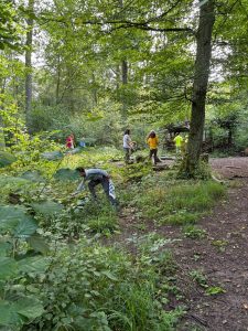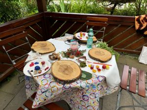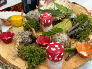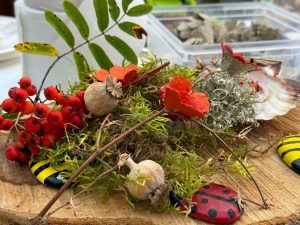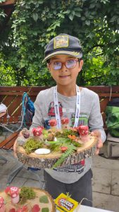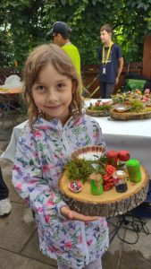 Wir begannen mit einem kleinen Kennenlernspiel und nach einer kurzen Einführung unter der Leitung von Nadine ging die Gruppe mit den Betreuerinnen in den Wald, um Blätter, Moos und andere Naturdekorationen für die Holzbretter zu sammeln.