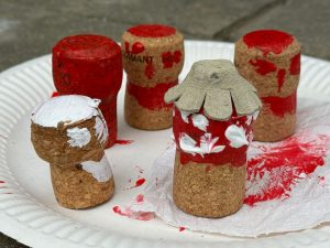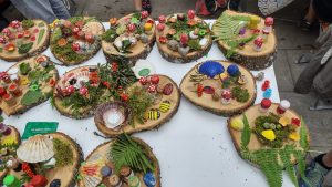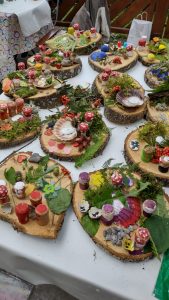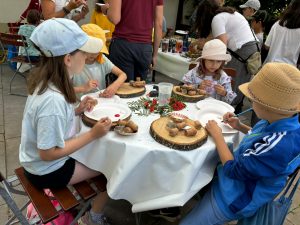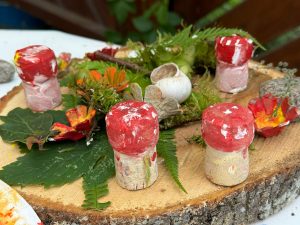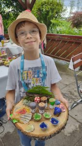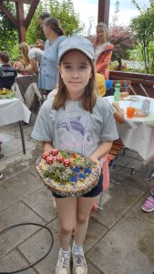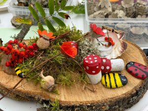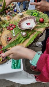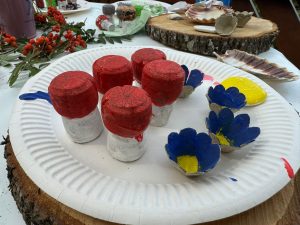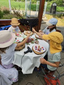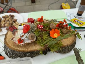 Nach der Rückkehr der Gruppe machen sich die Kinder gut gelaunt an das Dekorieren von Korken zu kleinen Pilzen, das Bemalen von Muscheln und Schneckenhäusern und das Bemalen von Blumen aus Pappe. Die Farben sind fröhlich und bunt, die Kinder sehr konzentriert!