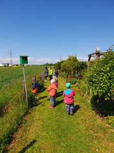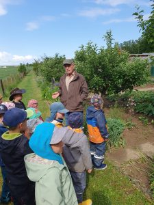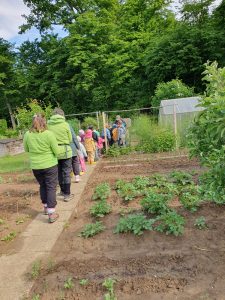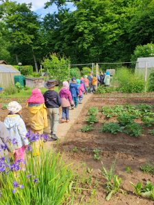Der Rundgang führte weiter zu den Beeten. Es gab so viel zu entdecken! Buschbohnen, Weißkohl, Erbsen – und unzählige Blumen in allen Farben. Besonders spannend wurde es, als Berthold einen grünen Spargel abschnitt. Die Kinder durften daran riechen, ihn genau betrachten und lernen, wie er wächst und schließlich blüht.