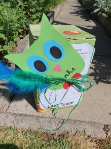 Zum Abschied hatten die Kinder eine Überraschung vorbereitet: Apfelsaft, frisch gepresst von den Äpfeln ihrer eigenen Bäume. Die Gartenfreunde nahmen das Geschenk mit großer Freude an.